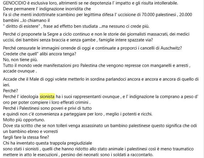 Antisionista che usa il suo profilo Facebook per pubblicare e condividere aggressivi messaggi pro pal pubblica un lungo commento focalizzato sulla figura delle senatrice a vita Liliana Segre dove accusa lo Stato di Israele ed il sionismo di essere come/peggio del nazismo e gli ebrei di volere l’esclusiva del genocidio. Il testo è infarcito di complottismo antisemita laddove si sostiene che le immagini delle sofferenze palestinesi verrebbero nascoste per venire incontro ai desideri dei potentissimi “sionisti” che sarebbero dappertutto. Inoltre le manifestazioni pro pal sarebbero proibite con la violenza sempre per venire incontro all’ “ideologia sionista”. Seguono tantissimi commenti che riprendono i contenuti del post iniziale, ovvero che la senatrice Segre sarebbe un “mostro sanguinario” complice del “genocidio”, che il sionismo sarebbe come/peggio del nazismo ed i “sionisti” potentissimi e tentacolari.