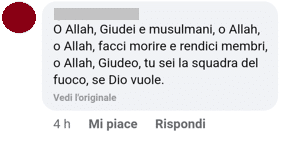 Stampa 26 Maggio 2024 Facebook, preghiera islamica su una pagina per israeliani in Italia Luogo: Facebook Fonte: Segnalazione Preghiera islamica per liberarci dai “giudei, inshallah”, tradotta con Google traduttore.