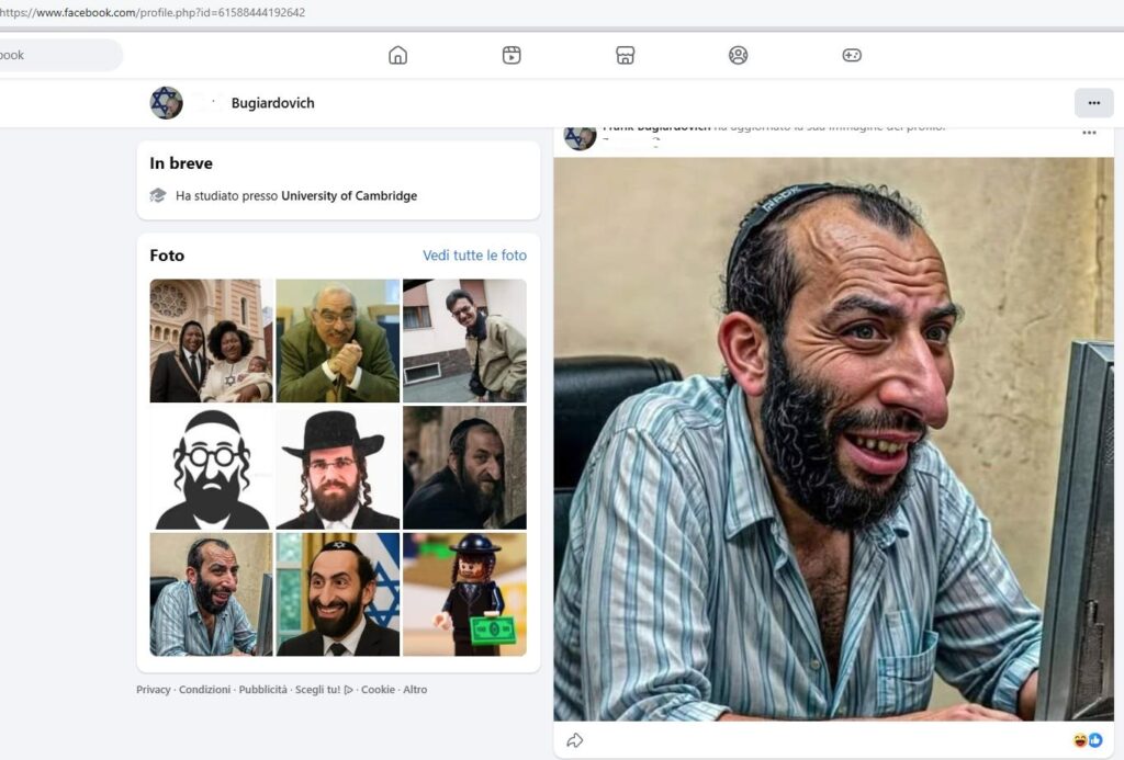 Attivista dell’antisemitismo telematico cura un profilo Facebook dove realizza meme e fotomontaggi brutalmente antisemiti e razzisti, i tropi giudeofobici utilizzati sono quelli tipici della più bieca propaganda contro gli ebrei (nasi adunchi, mani grifagne, attaccamento al denaro, etc.).