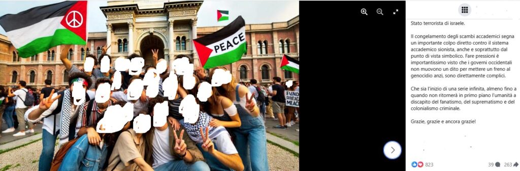 Stampa 1 Dicembre 2024 Facebook, profilo antisionista e putiniano Fonte: Segnalazione «Israele stato terrorista» Profilo Facebook seguito da circa 44mila persone pubblica commenti ed immagini che demonizzano il sionismo, promuovono il BDS e le posizioni dell’estremismo arabo-islamico.