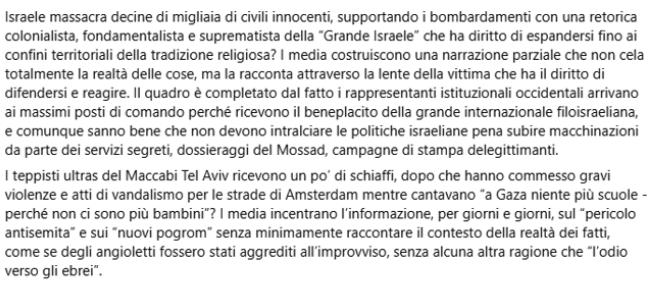 Profilo Facebook anticapitalista, “ecosocialista” e vicino ai paesi del gruppo Brics seguito da circa 21mila utenti, pubblica una lunga analisi del conflitto tra Hamas ed Israele e delle aggressioni antisemite di Amsterdam innervato di speculazioni complottiste e antisemite che sembrano ispirate alle tesi del libello Protocolli dei savi di Sion, solo che le accuse vengono rivolte all’ “internazionale israeliana” e non all’”internazionale ebraica”. Anche la Shoah viene letta come strumento di controllo e pressione sul mondo.