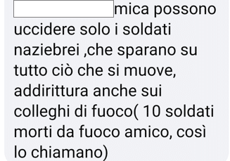 Stampa 12 Settembre 2024 Facebook, “soldati naziebrei” vittime dei “colleghi di fuoco” Luogo: Facebook Fonte: Segnalazione CE Utente commenta sotto al post di una pagina Pro Israele sostenendo che 10 soldati, “naziebrei”, siano morti da fuoco amico.