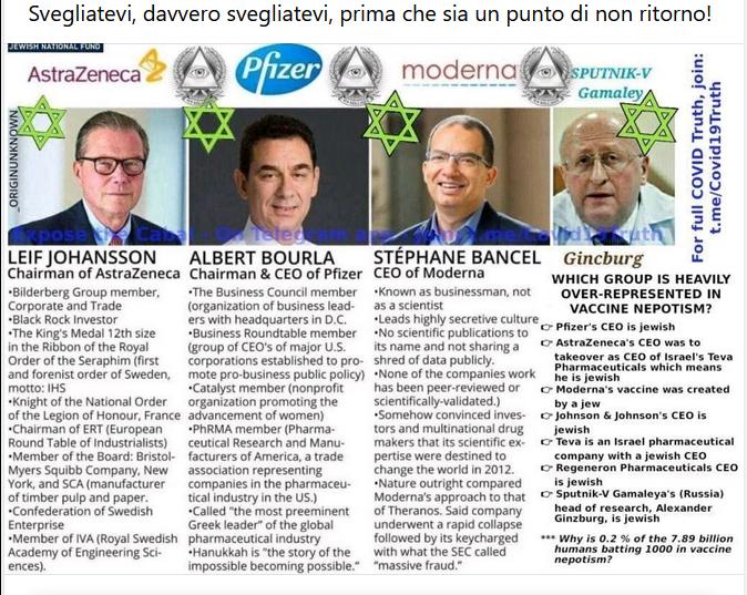 Simpatizzante di un partito della destra sovranista, posta sul suo profilo Facebook commenti complottisti e neofascisti, tra cui il meme antisemita che marchia come ebrei tutti i dirigenti delle maggiori aziende farmaceutiche in prima linea nella guerra contro la pandemia da coronavirus.