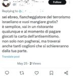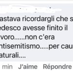Il caso della ristoratrice pro pal di Napoli fa da trampolino per attacchi antisemiti sul social web, dove arcaici stereotipi antigiudaici si mescolano ad invocazioni ad Adolf Hitler («se il tedesco avesse finito il lavoro…») che “avrebbe capito tutto sulla natura maligna degli ebrei”. Non mancano attacchi anche alla senatrice a vita Liliana Segre e l’incitazione a fare “pressione” sugli ebrei affinché comprendano bene l’odio che li circonda.