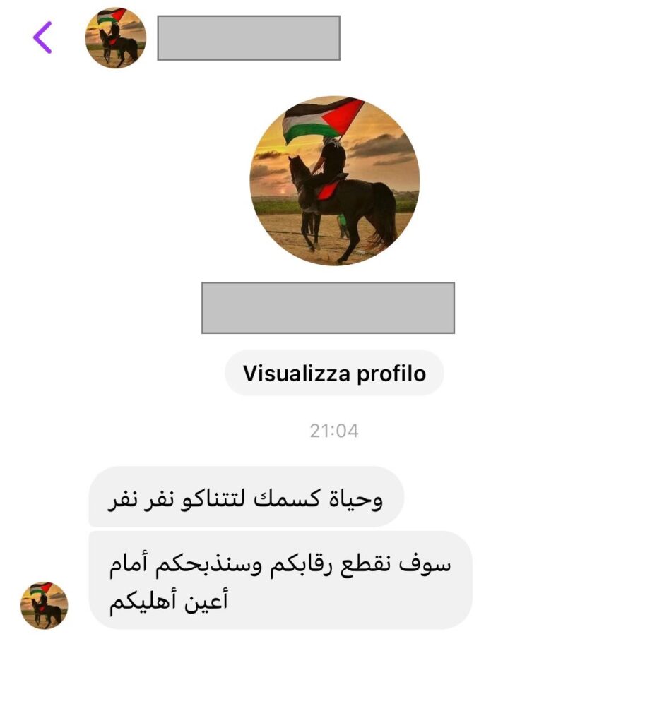 Stampa 31 Maggio 2024 Facebook, uomo riceve minacce di morte in arabo da un account sconosciuto Luogo: Facebook Fonte: Segnalazione CE Un uomo riceve su Messenger messaggi minatori in arabo: “Ti taglieremo la gola e ti massacreremo davanti alla tua famiglia”.