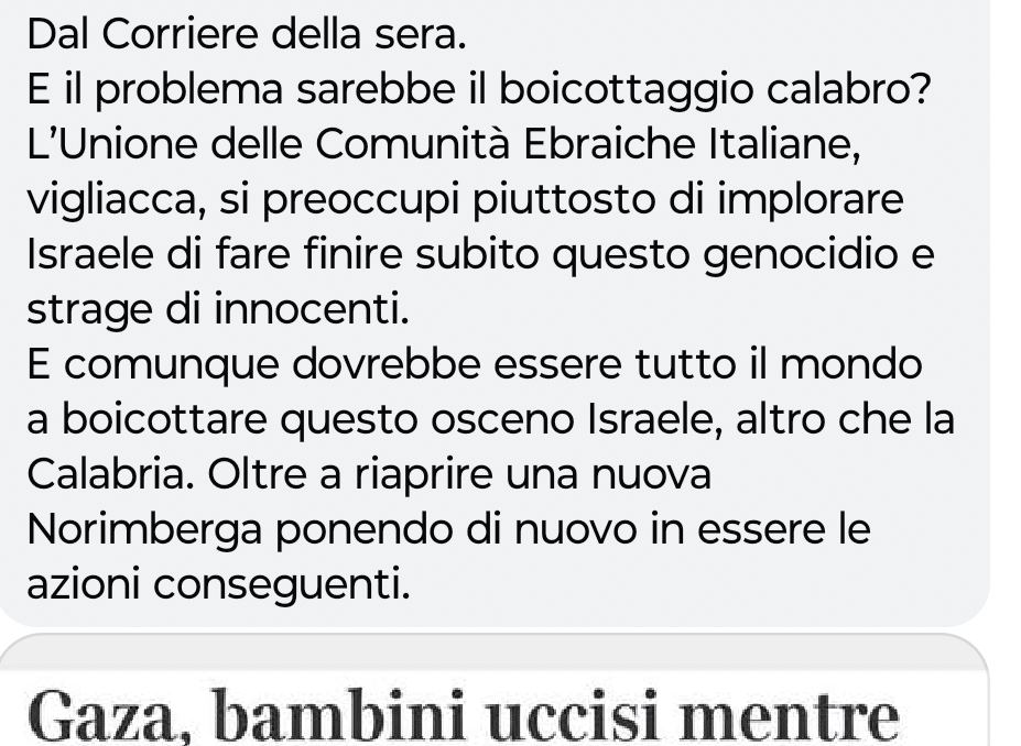 “L’Unione delle Comunità ebraiche, vigliacca, si preoccupi piuttosto di implorare Israele di fare finire subito questo genocidio e strage di innocenti”