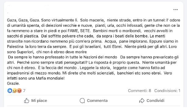 «Non sono mai stato antisemita. Ora lo sono. Non solo per le atrocità contro il Popolo Palestinese. Ma per la mentalità degli ebrei. Gli Ebrei sono il Male del mondo Se potessi farei come l’austriaco coi baffetti, si ma molto più in grande.»