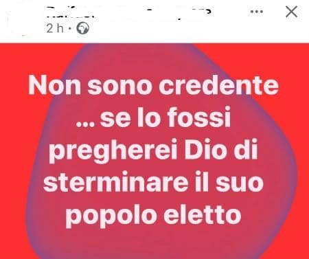 Attivista pro pal posta messaggi che incitano all’odio contro gli ebrei, eccone un esempio: «Non sono credente…se lo fossi pregherei Dio di sterminare il popolo eletto che in suo nome compie crimini contro l’umanità».