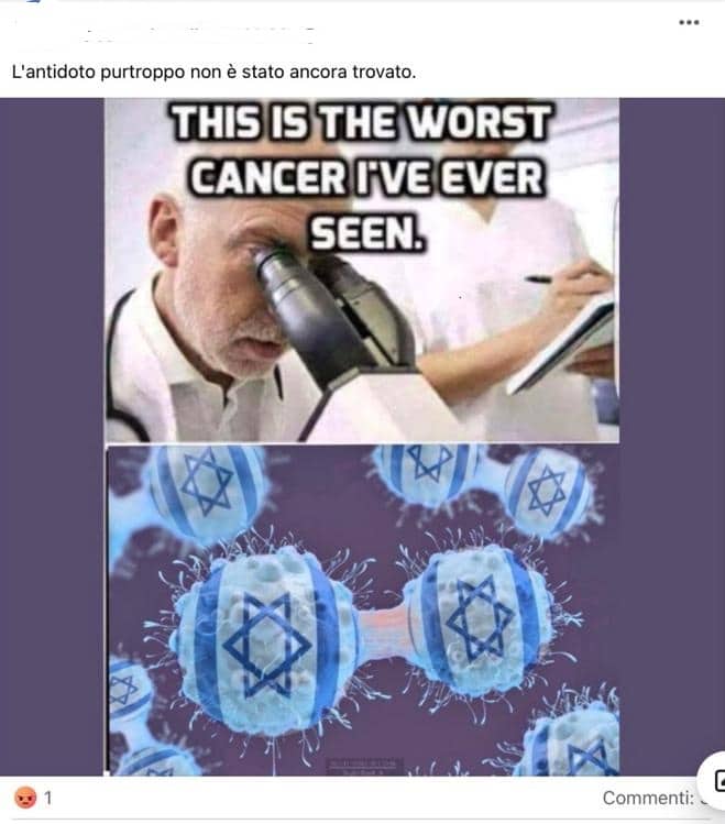 Stampa 1 Ottobre 2025 Facebook, utente pubblica post contro gli ebrei Fonte: Segnalazione «the synagogue of Satan» Utente Facebook posta commenti che demonizzano gli ebrei corredati da meme giudeofobici tra cui l’Happy Merchant, forse la più diffusa caricatura antisemita.