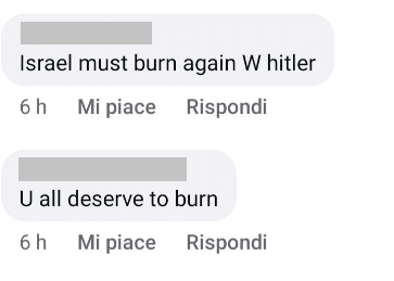 Stampa 22 Giugno 2025 Facebook, utenti pubblicano contenuti antisemiti Luogo: Facebook Fonte: Segnalazione “Il pittore austriaco aveva ragione con voi” “You all deserve to burn in hell” “Ebrei padroni del mondo… non consentito il minimo dissenso”