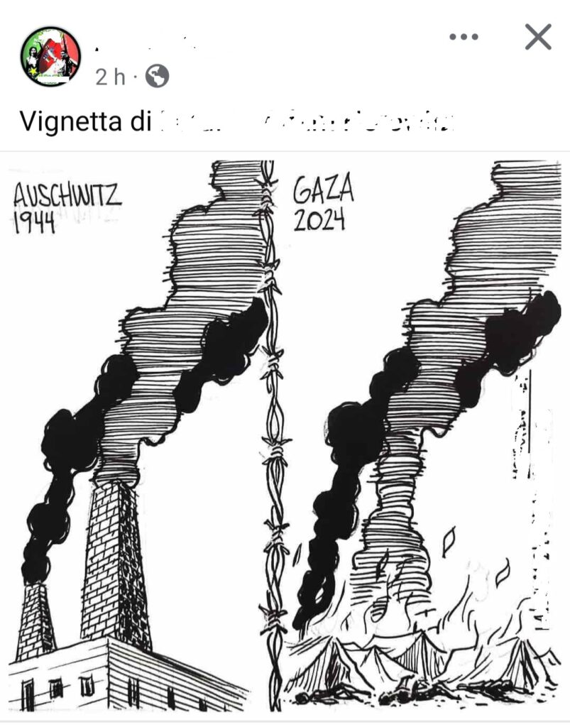 Stampa 9 Ottobre 2024 Facebook, vignetta che distorce la Shoah Fonte: Segnalazione CE «Auschwitz 1944 Gaza 2024» Gruppo Facebook vicino ad una associazione partigiana condivide una vignetta che equipara quanto accade a Gaza con la Shoah.