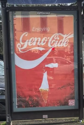 Stampa 3 Marzo 2024 Firenze, cartellone con messaggio di odio Luogo: Firenze Fonte: Segnalazione CE «Enjoiyng Geno Cide» Firenze. Fermata del bus, affisso un cartellone che riprende il logo della Coca-Cola e accusa lo Stato di Israele di genocidio.
