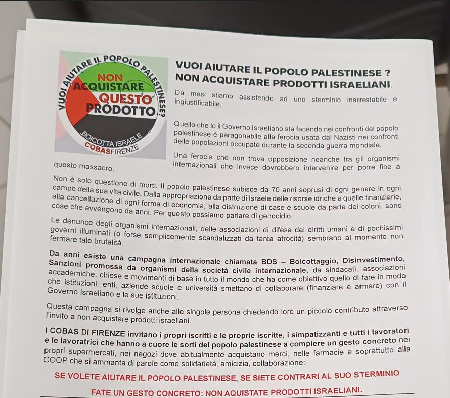 Firenze. Organizzazione di estrema sinistra promuove un corso di formazione per personale docente e ATA dai toni profondamente antisionisti e pro BDS. Gli oratori nei loro interventi innervati di errori storici e pregiudizi ideologici, dipingono lo Stato di Israele come terrorista, razzista e genocida.