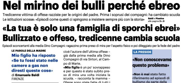 Parole che gonfiano il petto della mamma, «orgogliosa del mio ragazzo che ha difeso la religione di suo padre». Un riscatto di cuore e orgoglio che polverizza ogni passata umiliazione. Sì perché la storia di Marco, intelligente e sensibile, ha un prologo infarcito di piccole cattiverie quotidiane messe in atto da alcuni bulli – uno in particolare e cioè l’autore dell’ultima offese – già dalla prima media alla Dino Compagni di via Sirtori, al Campo di Marte.