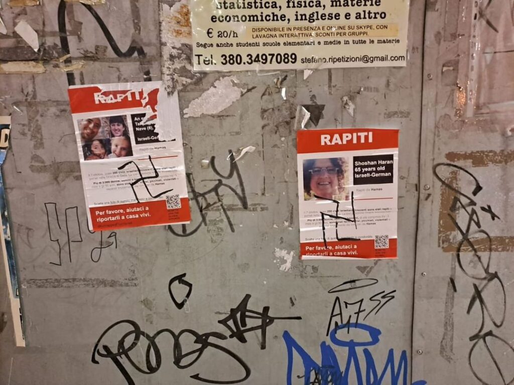 Stampa 27 Novembre 2023 Genova, volantino con i volti dei rapiti imbrattati con svastiche Luogo: Genova Fonte: UGEI In corso Gastaldi a Genova i manifesti con i volti dei civili israeliani rapiti da Hamas il 7-10-23 sono stati imbrattati con delle svastiche.