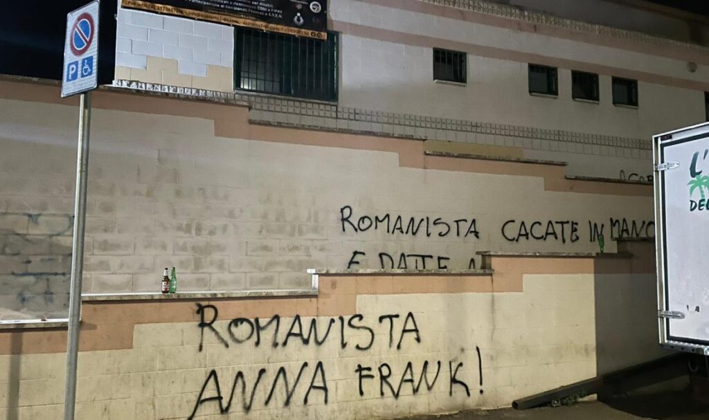 Stampa 27 Giugno 2022 Guidonia Montecelio (RM): scritte antisemite Luogo: Guidonia Montecelio (RM) Fonte: Segnalazione «Romanista Anna Frank Romanista ebreo» «Romanista Anna Frank Romanista ebreo». Scritte antisemite e svastiche sui muri della palestra comunale di Guidonia Montecelio (RM).