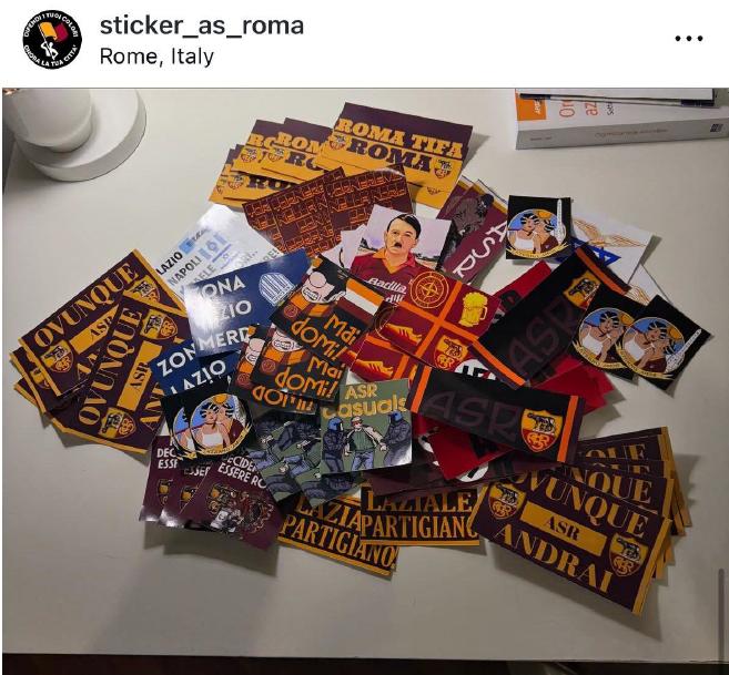 Pagina Instagram condivide l’immagine di un adesivo che ritrae Adolf Hitler con la maglia della squadra di calcio della Roma. Nella stessa foto, sulla destra, si vede lo stemma della Lazio accompagnato da una stella ebraica, mentre sulla sinistra è scritto “Lazio – Napoli – Israele”. Tutti adesivi con contenuti antisemiti.