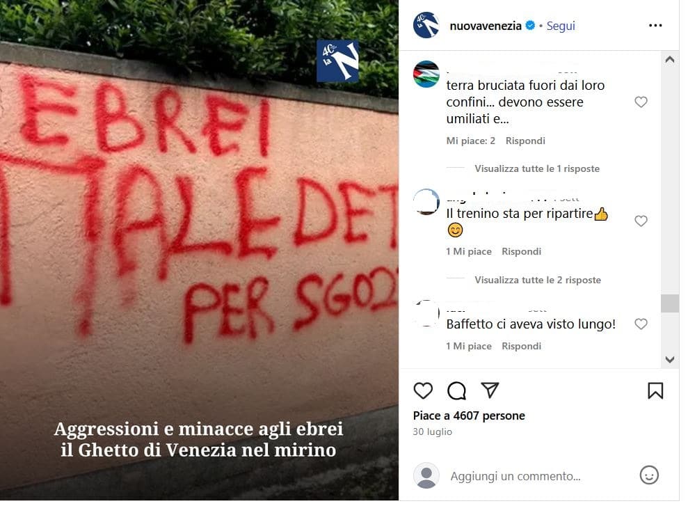 Pagina Instagram di un quotidiano veneziano posta la notizia sulle recenti “Aggressioni e minacce agli ebrei” a Venezia, la risposta di moltissimi internauti è un’ondata di invettive antisemite ispirate al conflitto a Gaza e basate sul concetto che Adolf Hitler avrebbe dovuto portare a termine lo sterminio di tutti gli ebrei. Qualche esempio di post: «Quanto aveva ragione lo zio Adolf adesso lo vedete, Il pittore austriaco ha sempre avuto ragione, Baffetto ci aveva visto lungo, Il pittore doveva finire l’opera».