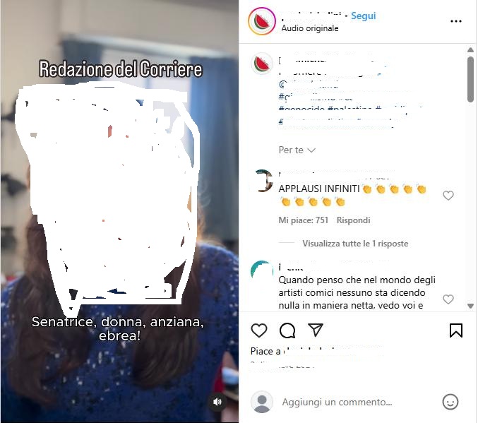 Attrice comica pro pal con un larghissimo seguito sul web sociale, si è specializzata nel prendere di mira gli ebrei, in uno dei suoi ultimi sketch si fa beffe del maggiore quotidiano nazionale visto come succube di Israele e, parlando di “genocidio”, irride a Liliana Segre. I followers dell’attrice le indirizzano centinaia di post dove manifestano il loro entusiasmo per le performances comiche (Sei una delle poche persone che mi rende fiera di essere italiana, grandissima, ti amo, straordinaria, geniale, Géniale ??? Troppo poco!! Tu sei indescrivibilmente unica: dialettica, espressione facciale e si, genio!, Oddio ti amo, se ti candidi, ti voto, etc.) e attaccano anche la senatrice, ecco alcuni esempi: «Ho sempre stimato la senatrice Segre. Ciò che ha passato lei non lo auguro a nessun…. Ah no aspetta, mi sa che la senatrice Segre non si è accorta che il suo popolo (e lei stessa) stanno facendo esattamente lo stesso alla Palestina ed al suo popolo? Forse è troppo complicato riconoscerlo? Forse è troppo complicato da ammettere che come gli ebrei hanno subito un genocidio ora sono gli artefici dello stesso medesimo comportamento da loro subito?!?!»; «Senatrice, donna, anziana, ebrea, ma soprattutto sionista. purtroppo certe signore anziane per convenienza o forse per arterosclerosi, strumentalizzano i propri traumi solo per quello che gli fa comodo.»; «Purtroppo, ad una certa età, inizia la demenza. Sapete…»; «Con rispetto parlando, ma sembra proprio che dalla Shoah non abbiano capito un cazzo…»; «Che poi è pure Sionista manco una vera ebrea»; «Ah ma quella che si inventó di aver ricevuto le minacce di morte per avere la scorta?»; «Sta vecchia strega…».