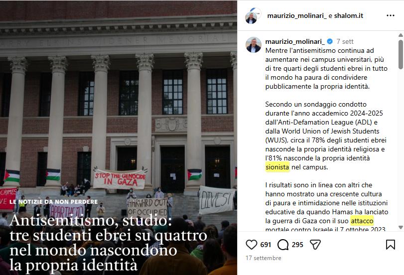 Il giornalista Maurizio Molinari, spesso vittima di episodi di antisemitismo, pubblica sulla sua pagina Instagram un articolo sulla diffusione dei sentimenti antiebraici tra gli studenti, seguono moltissime invettive contro gli ebrei del tipo: «Gli ebrei sono buoni solo per il sapone….su alle docce».
