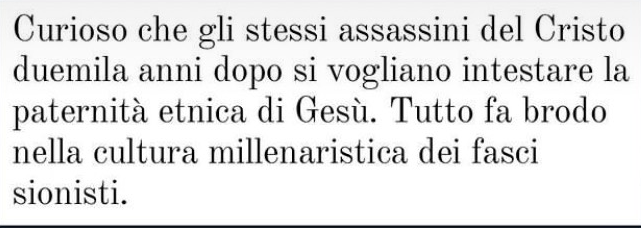 Artista Istagram seguito da circa 25mila followers e schierato in modo fermo con i palestinesi, pubblica una story che riprende, modernizzandola, l’accusa di deicidio, caposaldo dell’archivio antiebraico.