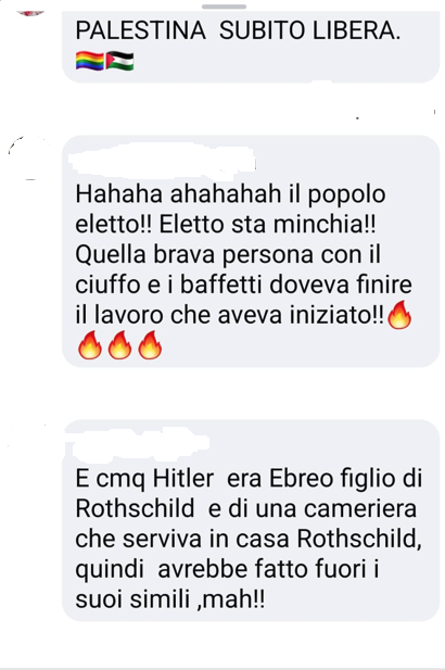 Utenti Instagram commentano in chiave antisemita. Il contenuto dei post, spesso accompagnati da emoticon scatologici, inneggia ad Adolf Hitler (Baffetto aveva ragione, Hitler doveva sterminarli), paragona i “sionisti” ai nazisti (Shalom è diventato Hi Hitler, Israele come Hitler) e lancia grevi insulti (bastardi, merd…merdacc…).