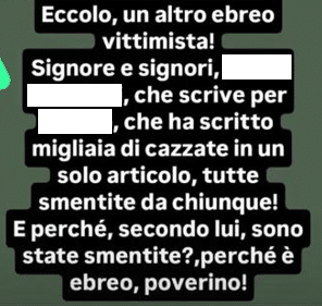 Un altro utente pubblica la sua foto accompagnata da affermazioni antisemite: “Ecco un altro ebreo vittimista”, senza argomentare ed entrare nel merito di ciò di cui trattano i suoi articoli – ma prendendolo di mira sul piano personale, per la sua religione.
