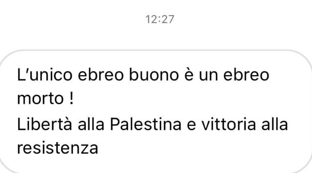 Stampa 7 Novembre 2023 Instagram, commento antisemita Fonte: Segnalazione CE «L’unico ebreo buono è un ebreo morto! Libertà alla Palestina e vittoria alla resistenza» Utente Instagram posta un commento antisemita ispirato al conflitto tra Hamas ed Israele.