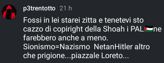 Utente Instagram con nickname che richiama la pistola usata dai terroristi brigatisti e che annovera tra i suoi followers una serie di estremisti, posta un greve commento contro la superstite dei lager Edith Bruck che si conclude così: «Sionismo = Nazismo NetanHitler…altro che prigione…piazzale Loreto…».