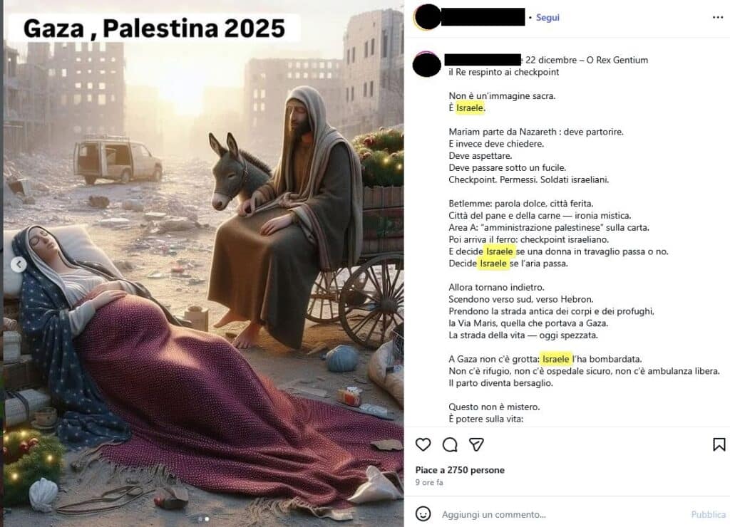 Post con contenuti altamente politicizzati e astorici della Natività, accompagnato da una didascalia che accusa Israele di “decidere se l’aria passa”. Il post ha totalizzato 2750 Mi piace.