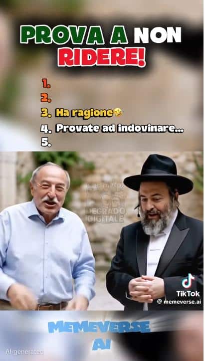 Breve video TikTok di barzellette razziste contro varie minoranze, irride anche gli ebrei. Un uomo maturo chiede ad un ebreo riconoscibile come tale: “Quanti di voi possono salire su una 500?”, l’ebreo risponde “ Credo quattro” e l’altro “Sbagliato! Quattro nei sedili e tutti gli altri nel posacenere”.