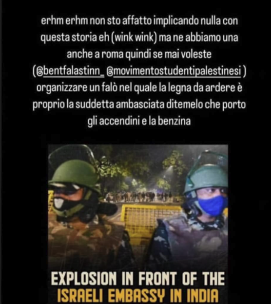 Estremista italo-palestinese vicina alla posizioni di Hamas, che già si è fatta beffe delle vittime israeliane dei massacri e rapimenti del 7 ottobre, posta su Instagram un commento che incita a dare alle fiamme l’ambasciata di Israele. La militante ha anche negato che le donne israeliane siano state stuprate e torturate dai terroristi palestinesi.