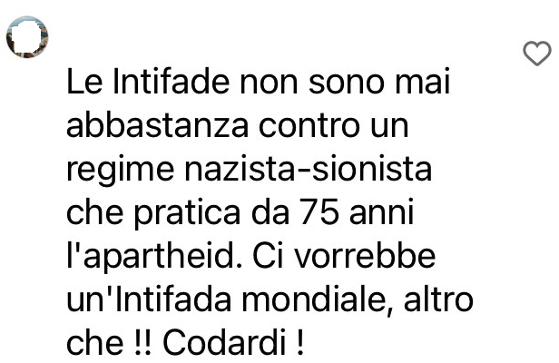 Stampa 21 Marzo 2024 Instagram, incitazione alla violenza Fonte: Segnalazione «Ci vorrebbe un’Intifada mondiale…» Utente Instagram scrive un post dove auspica una «Intifada mondiale».