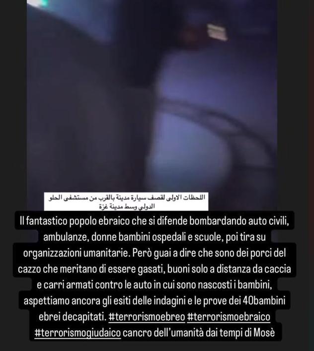 Utente Instagram, posta frequentemente su siti ebraici invettive antisemite caratterizzate da violenza e trivialità: «Il fantastico popolo ebraico che si difende bombardando auto civili, ambulanze, donne bambini ospedali e scuole…Però guai a dire che sono dei porci del cazzo che meritano di essere gasati…cancro dell’umanità dai tempi di Mosè».