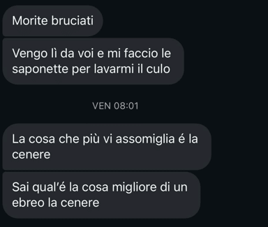 “Morite bruciati” “Vengo li da voi e mi faccio le saponette per lavarmi il c****” “La cosa che più vi assomiglia è la cenere”
