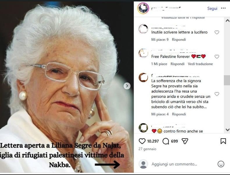 Attivista pro pal pubblica sul suo profilo Instagram una lettera alla senatrice Segre «Lettera aperta a Liliana Segre da Najat, figli di rifugiati palestinesi vittime della Nakba» seguono centinaia di commenti che in larga parte offendono ed irridono la senatrice Segre («Ebbasta con sta vecchiaccia sionista») e l’accusano di “complicità” con il “genocidio” dei palestinesi.