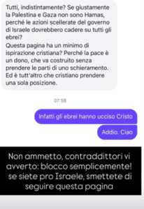 “Ebrei assassini” “Infatti gli ebrei hanno ucciso Cristo. Addio. Ciao. Non ammetto contraddittorio vi avvero: blocco semplicemente! se siete pro Israele, smettete di seguire questa pagina”