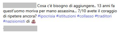 Un utente italiano su Instagram posta contenuti offensivi (pecore di m*, fanatici, schifosi sionisti) di natura cospirativista e denigratoria, compresi insulti e bestemmie.