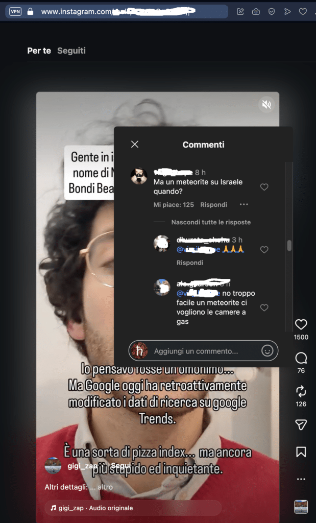 Influencer Instagram posta un video cospirativista dedicato alla strage antisemita di Sidney, seguono commenti brutalmente antiebraici che auspicano la distruzione dello Stato di Israele e una nuova Shoah per gli ebrei.