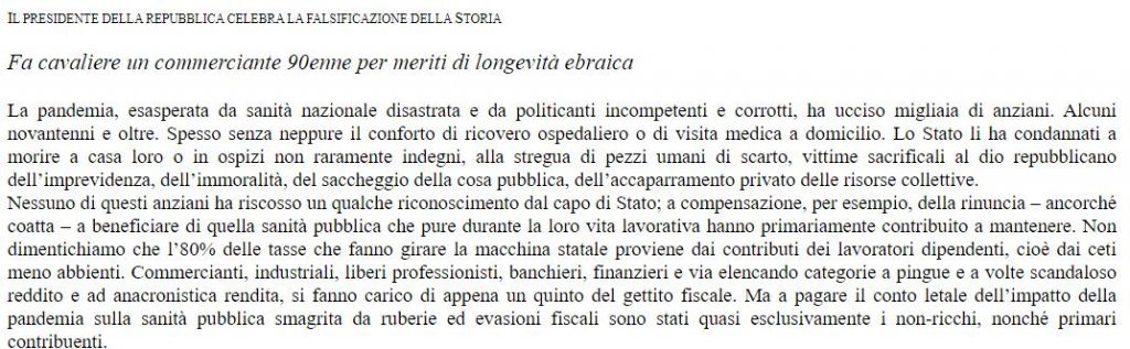 «La Storia ha inconfutabilmente ridicolizzato queste leggende, che del resto non hanno mai avuto diritto di cittadinanza nei documenti e nelle ricerche scientifiche. Anche il numero di vittime ebree è stato ridimensionato: da 6 milioni a 900 mila; quasi tutte uccise dal tifo, il resto da una violenza bellica che provocò mondialmente 56 milioni di morti d’ogni bandiera e dove i russi, con 26 milioni di deceduti, sono l’etnia più sacrificata. Nell’anno di grazia 2020 la comunità scientifica è sempre in attesa che i sostenitori del cosiddetto olocausto dimostrino l’esistenza di una – anche una sola! – camera a gas gestita dai nazisti a scopo di sterminio ebraico. Eppure il nostro Sergio Mattarella ha decorato Samuel quale sopravvissuto al «campo di sterminio» (sic!) di Auschwitz e per la sua meritoria «testimonianza di quell’inferno».