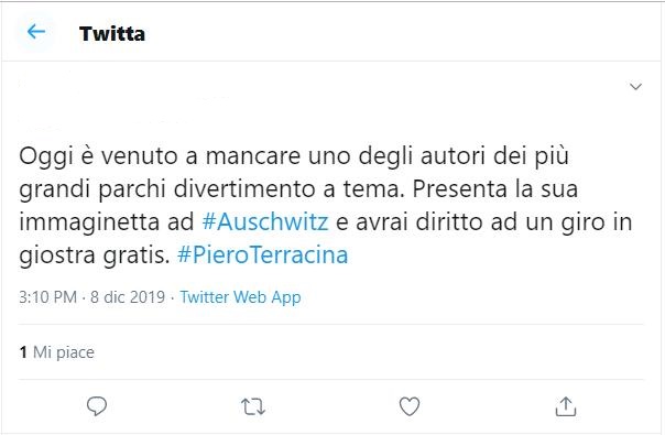 Il decesso di Piero Terracina, uno degli ultimi sopravvissuti al campo di sterminio di Auschwitz, è stato accolto dai professionisti dell’antisemitismo telematico con numerosi commenti giudeofobici dove negazione della Shoah e volgare irrisione degli ebrei sono strettamente legati.