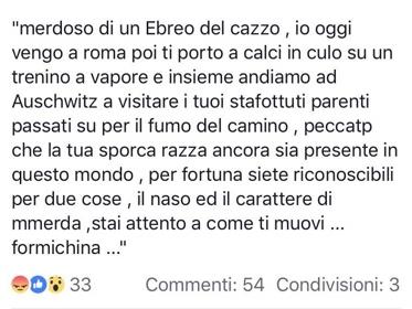 S.D. posta spesso dei commenti su Facebook, e recentemente è stato pesantemente insultato via Messenger da N.A. : «merdoso di un Ebreo del cazzo, io oggi vengo a roma poi ti porto a calci in culo su un trenino a vapore e insieme andiamo ad Auschwitz a visitare i tuoi strafottuti parenti passati su per il fumo del camino, peccatp che la tua sporca razza ancora sia presente in questo mondo, per fortuna siete riconoscibili per due cose, il naso e il carattere di mmerda, stai attento a come ti muovi…formichina.»