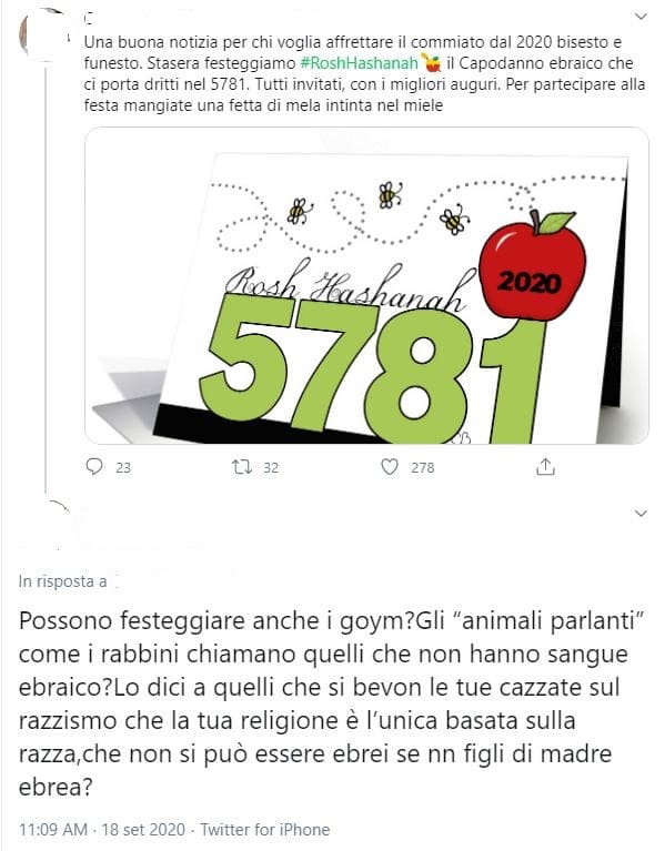 In occasione del capodanno ebraico (Roh haShanà) 5781 politici, giornalisti e presidenti di Comunità Ebraiche hanno inviato attraverso le maggiori piattaforme sociali gli auguri di buon anno, seguono numerosi commenti giudeofobici che invitano i politici a “pensare agli italiani e non agli ebrei”, o che ripropongono arcaiche accuse contro gli ebrei.