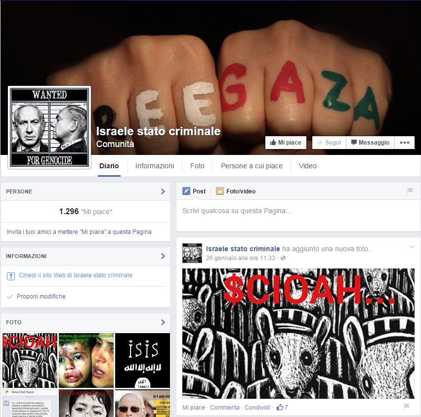 “Israele stato criminale” è un profilo Facebook antisemita che, con frequenza, pubblica fotomontaggi e commenti antisemiti, antisionisti e di ispirazione negazionista.
