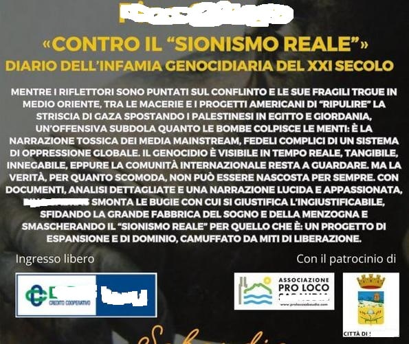 Rassegna culturale in provincia di Latina, con patrocinio di comune , pro loco e di una banca, presenta un saggio con contenuti antisemiti scritto da un giornalista ed ex parlamentare. Il testo si basa sul fatto che il sionismo sarebbe un’ideologia razzista e genocida che, con il suo potere, manipola la realtà presentandosi come un agnello quando in realtà è lupo famelico.