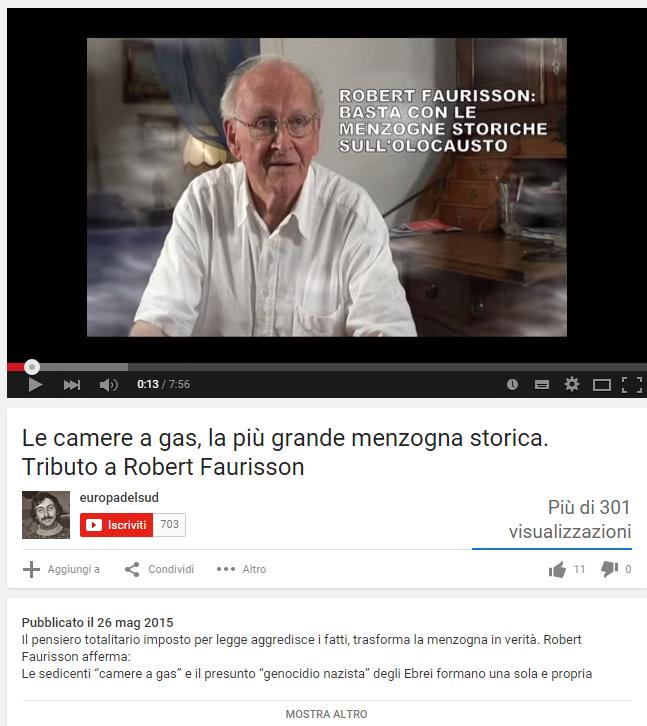 ha caricato sulla piattaforma YouTube un documentario negazionista autoprodotto della durata di 7 minuti e 57 secondi dal titolo “Le camere a gas, la più grande menzogna storica. Tributo a Robert Faurisson”.