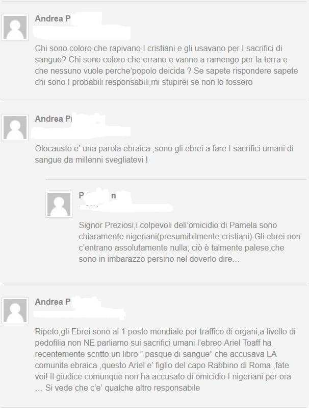 ErXXX, noto sito web dedicato alla diffusione di idee della Tradizione, pubblica un articolo dove l’efferato omicidio di Pamela Mastropiero viene spiegato come un rituale negromantico praticato da uno stregone africano, seguono una ventina di commenti, spesso critici nei confronti dell’interpretazione ritualistica proposta, tra di essi si inserisce l’ utente Andrea P. che invece accusa gli ebrei di aver praticato questo omicidio perché: «sono gli ebrei a fare i sacrifici di sangue da millenni svegliatevi !» , di fronte alla contestazione di P. N. Andrea P. replica: «Ripeto,gli Ebrei sono al 1 posto mondiale per traffico di organi,a livello di pedofilia non NE parliamo sui sacrifici umani l’ebreo Ariel Toaff ha recentemente scritto un libro ” pasque di sangue” che accusava LA comunita ebraica ,questo Ariel e’ figlio del capo Rabbino di Roma ,fate voi! Il giudice comunque non ha accusato di omicidio I nigeriani per ora … Si vede che c’e’ qualche altro responsabile».