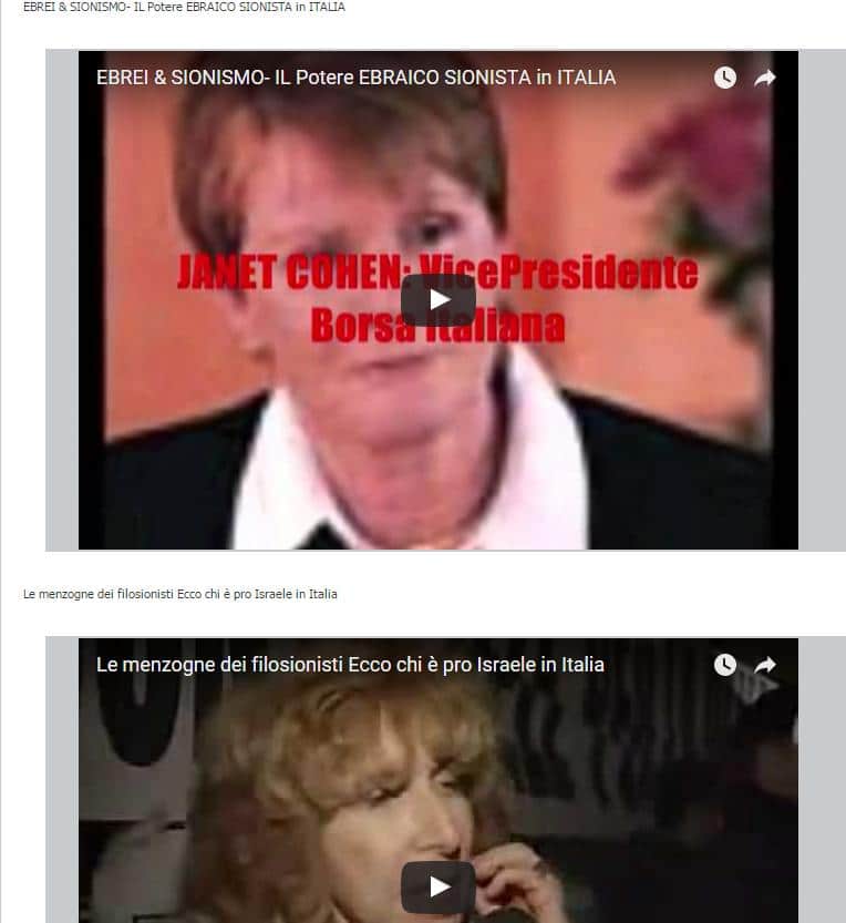 Nella pagina sono linkati anche documentari antisemiti che accusano gli “ebrei/sionisti” di dominare il mondo.
