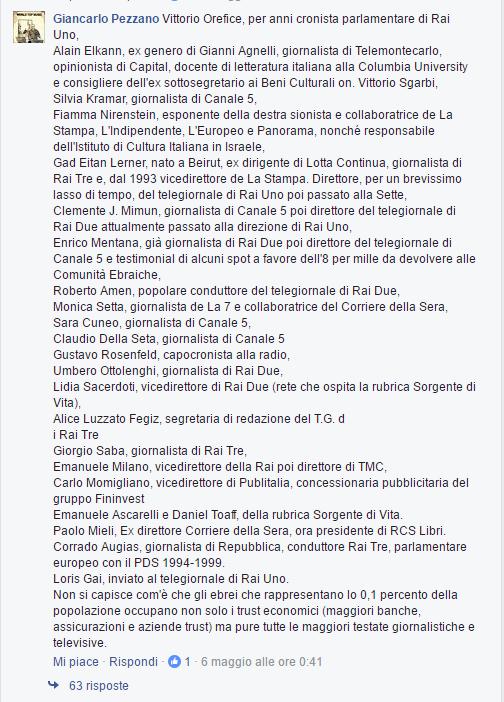 Venerdì 5 maggio il deputato del Movimento5Stelle Manlio Di Stefano ha pubblicato sul suo profilo Facebook un lungo post dai toni antisionisti “Complici dei danni di Israele” a cui sono seguiti centinaia di commenti – numerosi quelli antisemiti – particolarmente virulenti i post (alcuni anche con link di video antisemiti neonazisti) di Giancarlo Pezzano che, oltre ad insulti antisemiti spesso densi di trivialità, ha pubblicato una lunga lista di proscrizione antisemita, la cui fonte originaria è forse una piccola pubblicazione di Dagoberto Bellucci, I-Tal-Ya. Ebrei e Lobbies ebraiche in Italia, Effepi, Genova 2003, che a pag. 37 presenta l’elenco pubblicato. Manlio Di Stefano non modera il suo profilo Facebook e quindi i commenti antisemiti dei suoi followers continuano ad essere online.