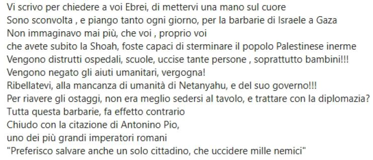Signora invia un’email ad un ente ebraico nella quale invita gli “Ebrei” a “mettersi una mano sul cuore” e a non sterminare il popolo palestinese inerme, come se gli ebrei italiani fossero colpevoli e corresponsabili di quanto accade in Medio Oriente.